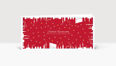 Mit dieser Weihnachtskarte versenden Sie schöne Weihnachts- und Neujahrsgrüße aus Hamburg. Ein weihnachtlicher, rot gefärbter Sternenhimmel - gerahmt durch die wichtigsten Sehenswürdigkeiten der Hamburger Skyline: Darunter die Elbphilharmonie, das Rathaus, der Michel, die Hafencity, die Speicherstadt, der Fernsehturm, die Binnenalster sowie der Hafen mit seiner Hafenbrücke. Fröhliche Weihnachten aus Hamburg!